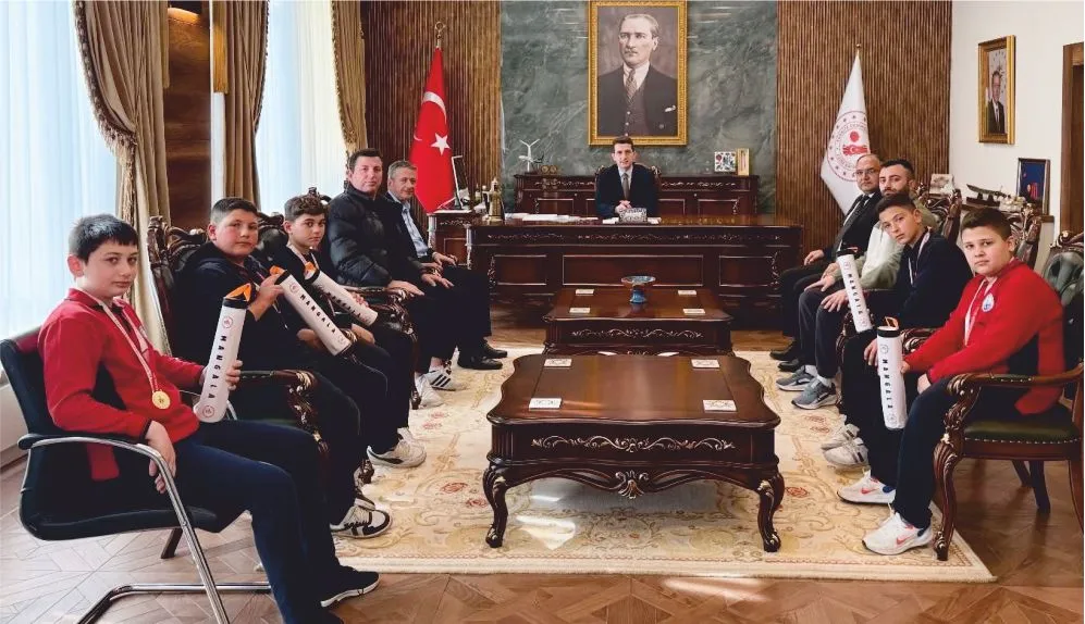 Okullar Arası Küçükler Serbest Güreş müsabakalarında İlçemizi temsil ederek Çanakkale İl Birincisi olan ve 26-29 Mart 2026 günlerinde Bilecik'te düzenlenecek grup müsabakalarında Çanakkale'yi temsil etmeye hak kazanan Ezine Belediye Güreş Takımı öğrencileri, İlçe Gençlik ve Spor Müdürü Soner ŞAHİN, İlçe Millî Eğitim Müdür Vekili İsmail TİLGEN, Güreş Antrenörleri Burak AKMAN ve İdris YILMAZ ile birlikte Kaymakam Yusuf KAPTANOĞLU'nu ziyaret ettiler. Kaymakam Yusuf KAPTANOĞLU, elde ettikleri başarıdan dolayı minik güreşçileri ve İlçemizde geleneksel sporların yaşatılmasına, çocukların sportif gelişimine katkı sağlayan antrenörleri tebrik ederek, Bilecik'te düzenlenecek grup müsabakalarında Çanakkale'yi temsil edecek öğrencilere başarılar diledi.